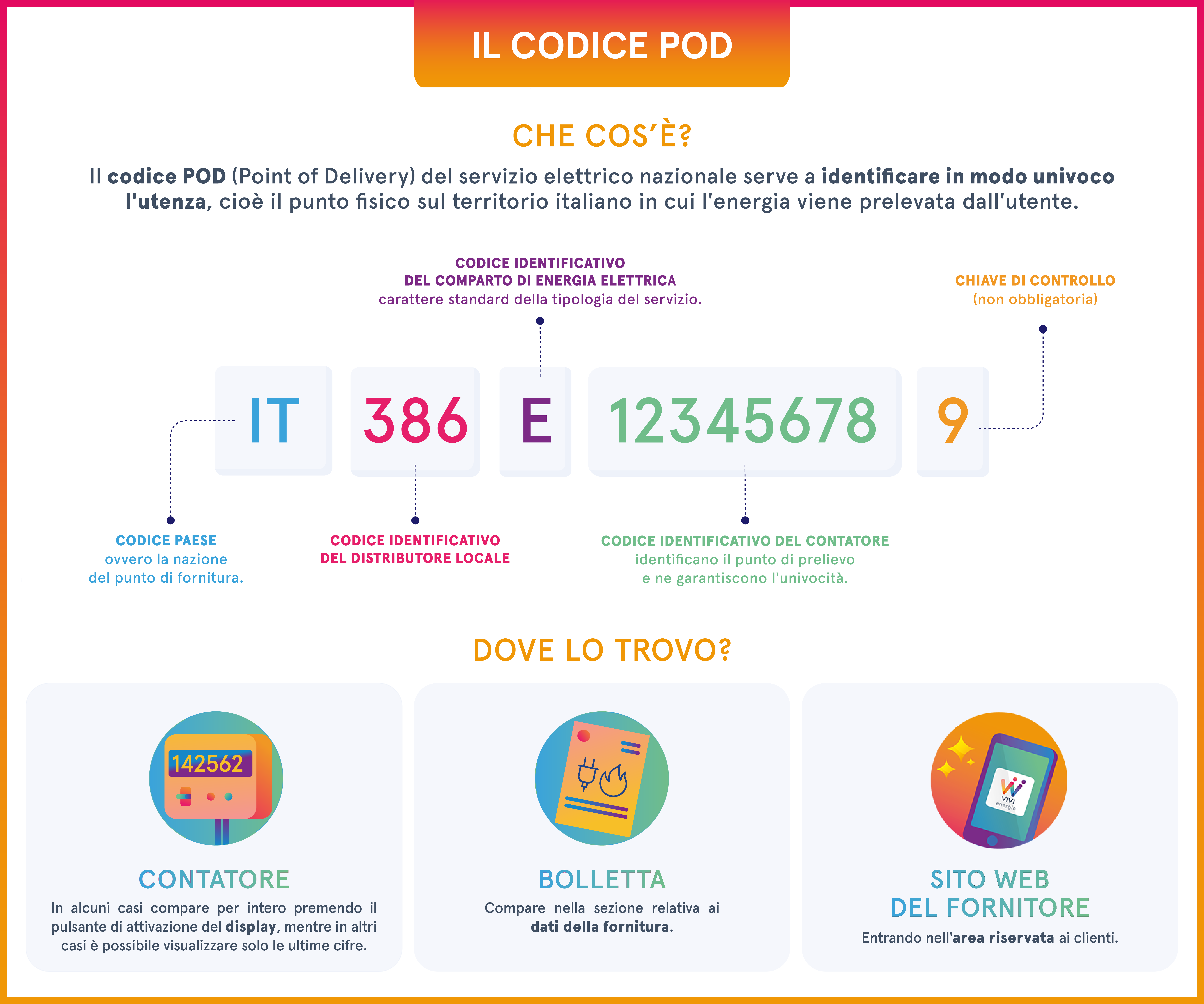 È l’acronimo di Point Of Delivery e consiste in un codice alfanumerico presente su ogni fattura di fornitura di energia elettrica. Per capire meglio la sua funzione potremmo dire che il codice POD rappresenta il “codice fiscale” dell'utenza elettrica, per questo resta invariato anche in caso di cambio di fornitore, voltura o subentro.