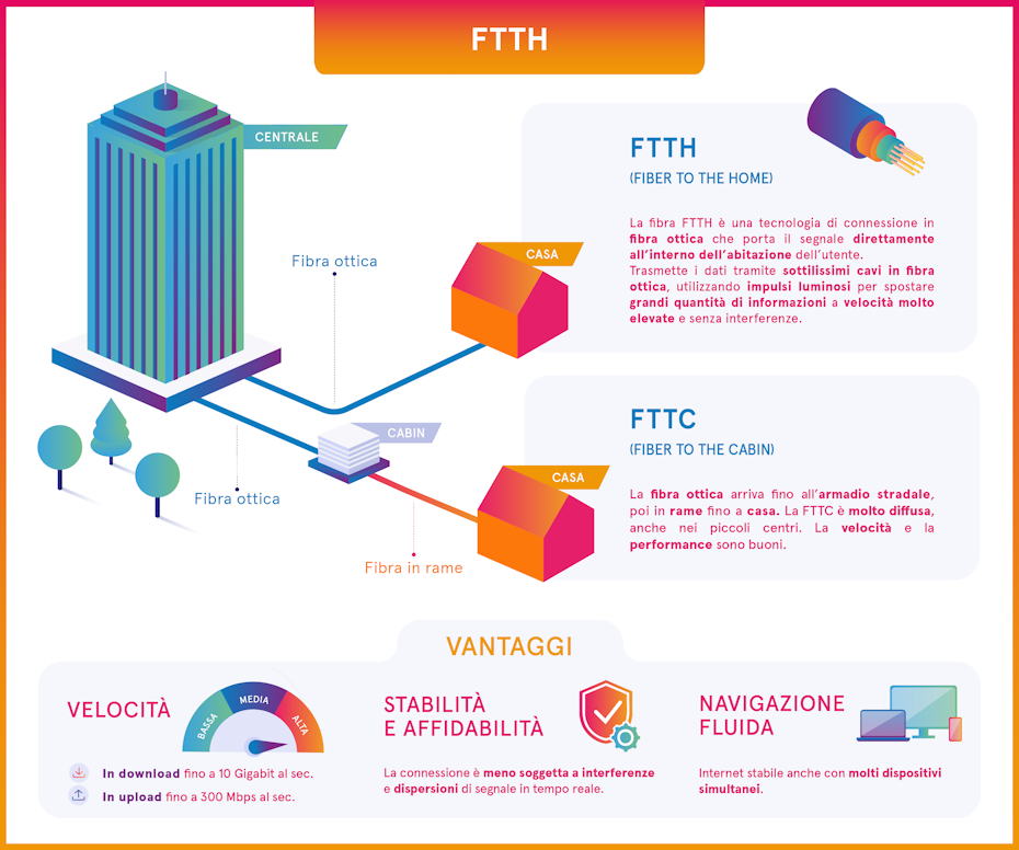 La fibra FTTH (o fibra ottica FTTH) è un’evoluzione della fibra ottica utilizzata fino a pochi anni fa, si tratta infatti di una rete di cavi che porta la fibra direttamente all’interno dell’abitazione dell’utente senza tratte in rame come avviene con la semplice fibra ottica; la sigla FTTH significa infatti Fiber To The Home, ovvero fibra fino a casa. Il collegamento dalla centrale di trasmissione al modem dell’utente è interamente in fibra ottica. La fibra FTTH rende la connessione e l’accesso alla banda larga più veloci ed è caratterizzata da:
