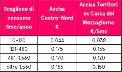 Nella tabella seguente si può apprezzare la differenza fra l’aliquota relativa al centro-nord e quella del mezzogiorno, a seconda degli scaglioni di consumo.