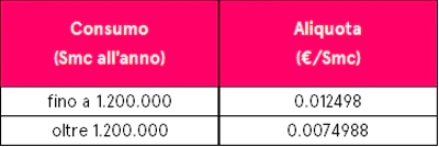 Nella tabella si può osservare la riduzione dell’aliquota dopo il limite dei 1.200.000 Smc all’anno: