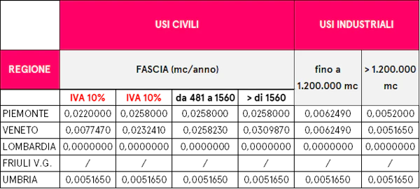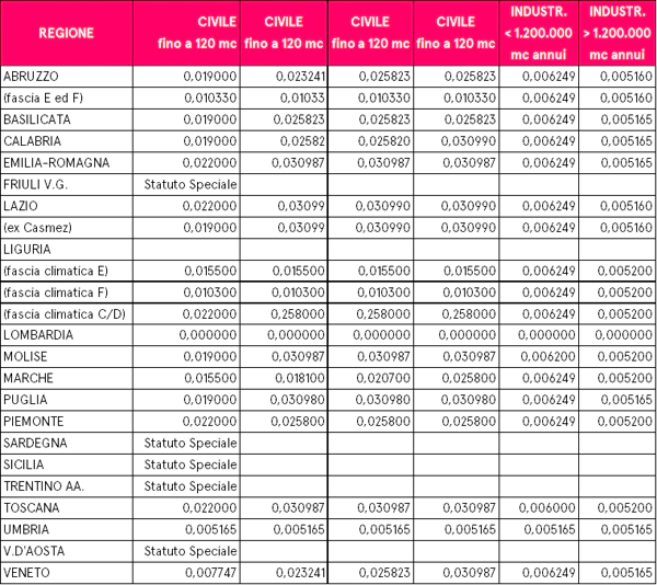 Nella tabella di seguito, è possibile vedere la distribuzione delle addizionali. Tutti i valori sono espressi in € / Smc: